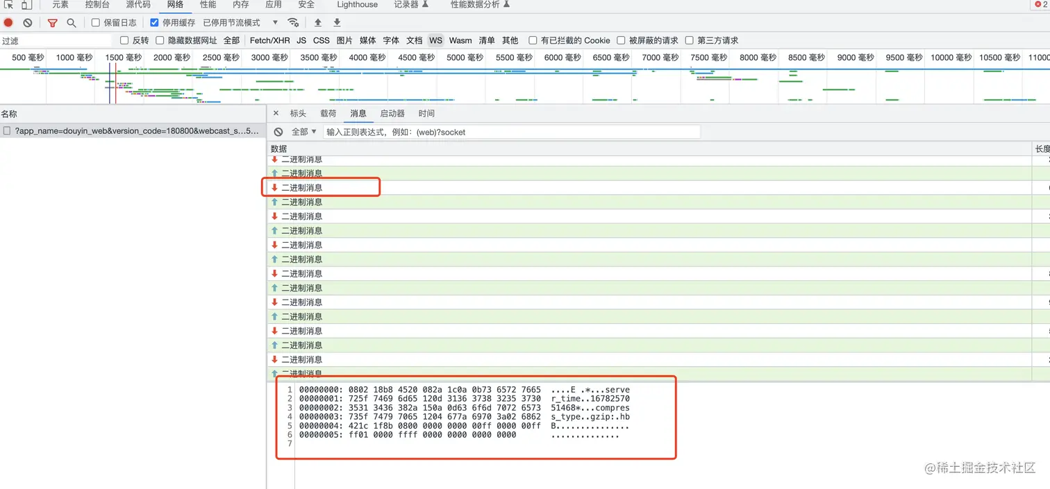 弹幕在浏览器显示的数据是在后台发送给浏览器的,可以看到这些数据是二进制数据,红的代表后台返回,绿色的代表浏览器请求后台;