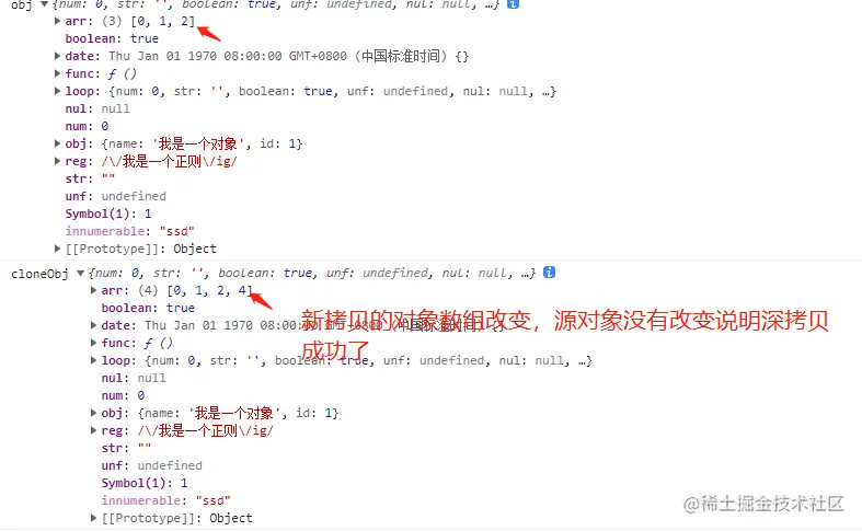 # vue 如何完整深拷贝出data里的数据(包括不可枚举的和原型链上的数据)? 用户8215142325537 2023-03-22 66 阅读1分钟 拷贝在当前作用域里创建的数据都是可以的。如图 但是拷贝data里的数据就不行,如图 新对象里数组改变之后源对象的数组也改变了,这明显不是深拷贝。