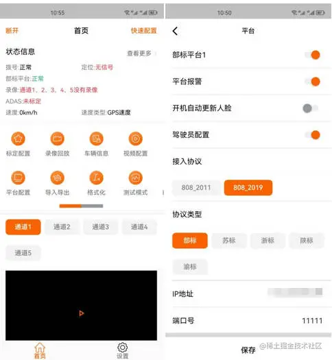 4)打开部标平台1开关,接入协议选择【808_2019】,协议类型选择【部标】,将EasyCVR中配置的IP地址填入到此处,如图: