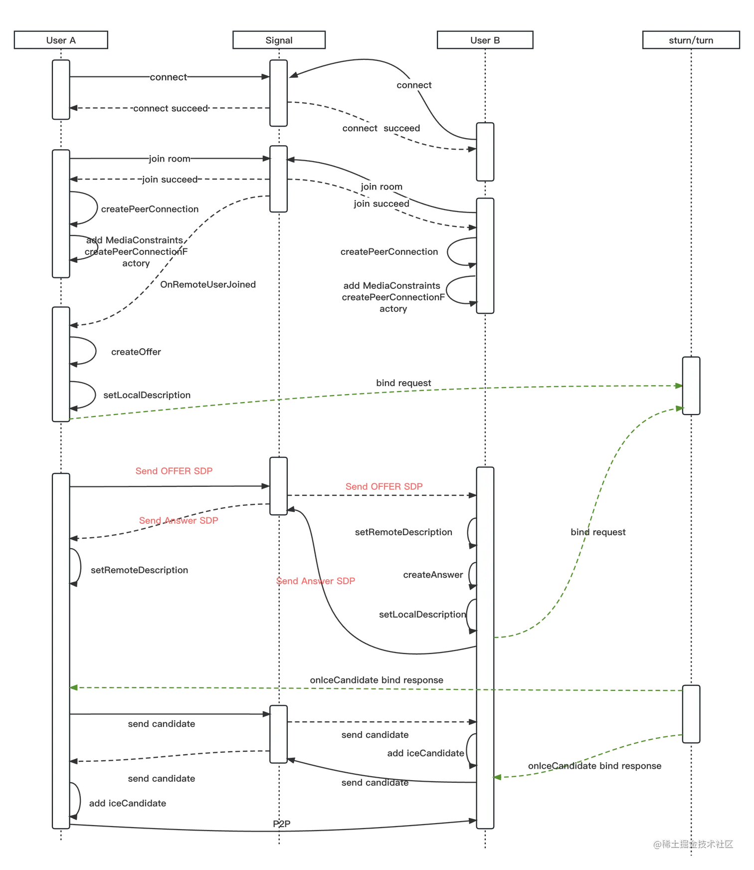 - UserA 和 UserB 分别生成 ICE(Interactive Connectivity Establishment)候选,即可用的网络地址。