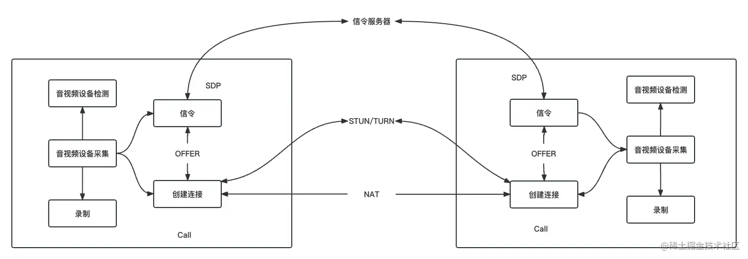 - RTCPeerConnection:实现 P2P 通信,处理音视频编解码、网络通信等。负责处理信令过程、交换媒体信息以及协调 NAT 穿透。