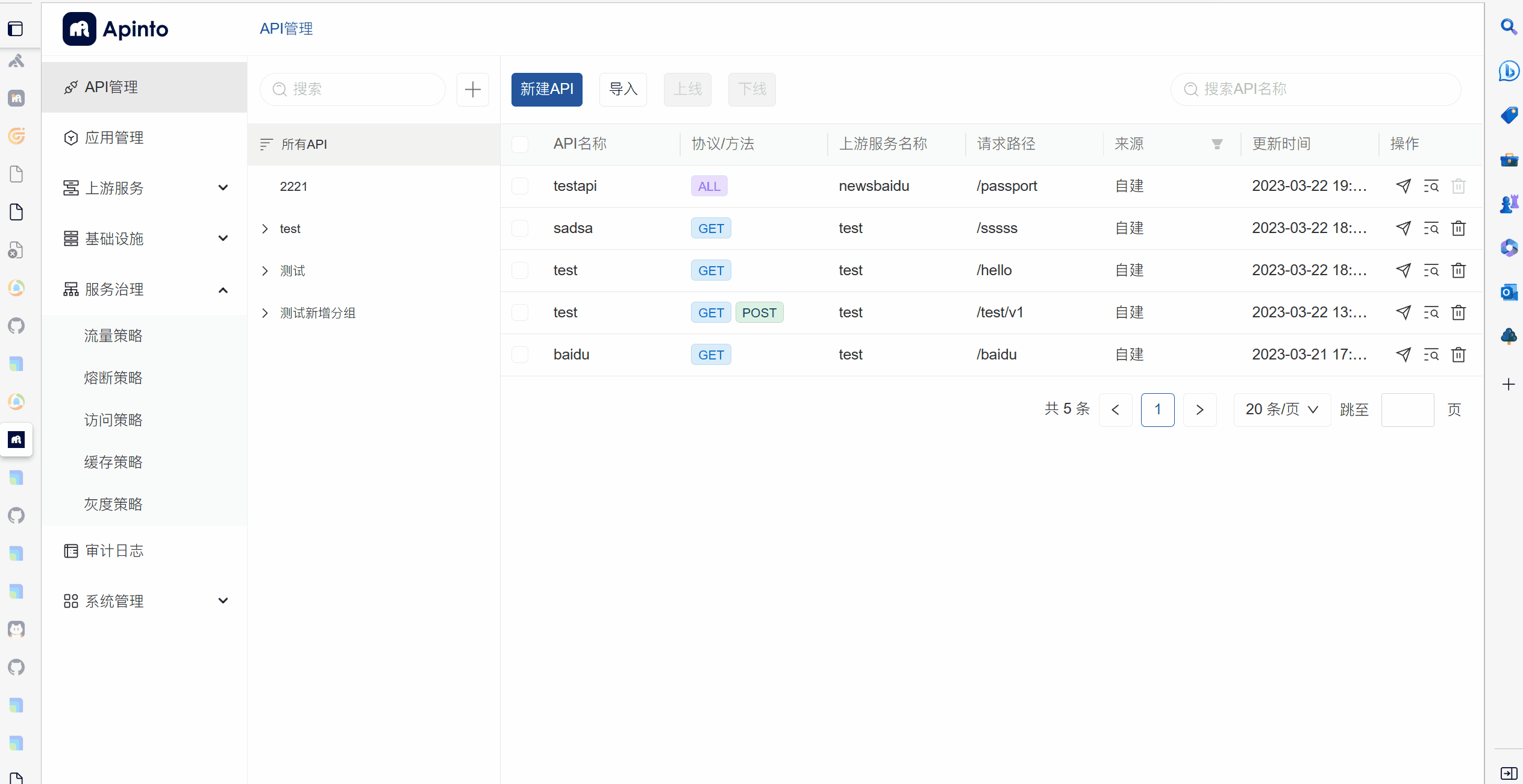 当用户调用API的请求通过了某个应用的鉴权,可以将该应用认为是API的调用方,应用的相关信息也会被赋予该请求。此外,Apinto的流量策略、访问策略等服务治理功能,能够对特定应用生效。结合策略和应用,也能够从应用的维度对API进行限流等访问控制。