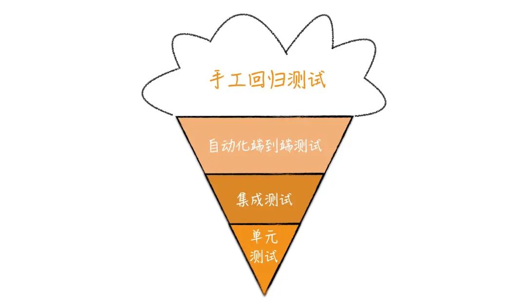 在这个图里,单元测试在最下面,表示它是底层的;然后层次逐渐升高,系统测试,也就是图上的端到端测试就是高层测试,在最上面。所有自动化测试形成了蛋卷部分,而外面的冰淇淋部分则是手工的测试。
