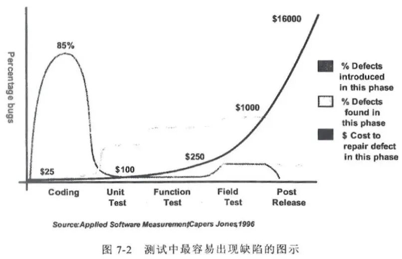 | 这张图来自微软的统计数据:Bug在单元测试阶段被发现,平均耗时3.25小时,如果漏到系统测试阶段,要花费11.5小时。 | 这张图,旨在说明两个问题:85%的缺陷都在代码设计阶段产生,而发现Bug的阶段越靠后,耗费成本就越高,指数级别的增高。 |