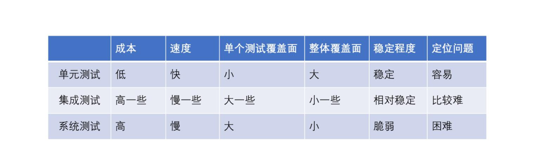 测试金字塔的出发点是低层测试成本低、速度快、整体覆盖面广,所以要多写。因为低层测试覆盖了几乎所有的情况,高层的测试就可以只做一些大面上的覆盖,保证不同组件之间的协作是没有问题的。在这个模型里,主力是单元测试,而高层的测试则是作为补充。