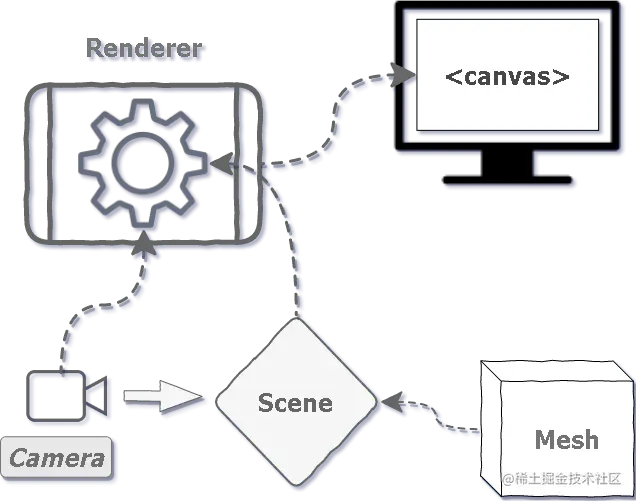 renderer.render(scene, camera) // 透过camera将观察到的sene绘制到<canvas>中