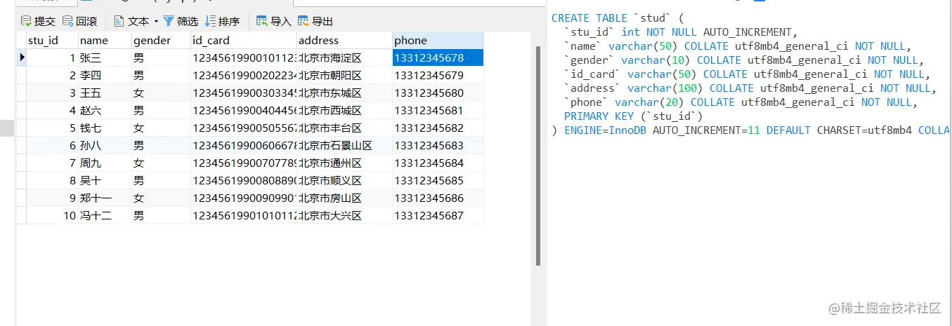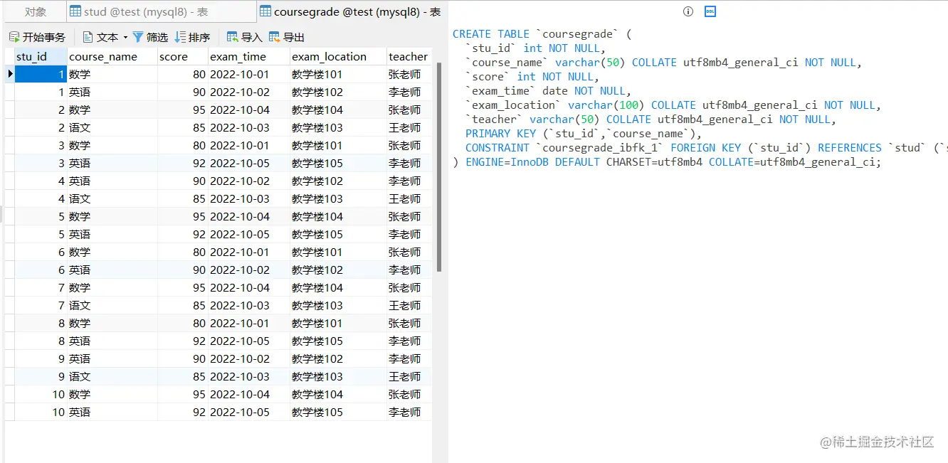 创建两个表,一个表为学生信息表stud(学号 姓名 性别 身份证 家庭地址 电话),一个为学生成绩表CourseGrade(学号,课程名称,考试分数 考试时间 考试地点 任课老师),插入至少10个学生,其中6个男生,4个女生,成绩表中插入至少两门课程和10个学生的两门课程的成绩。