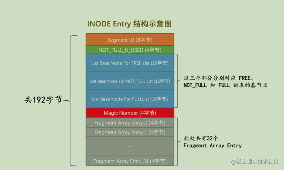 - Fragment Array Entry: 我们前边强调过无数次段是一些零散页面和一些完整的区的集合,每个 Fragment Array Entry 结构都对应着一个零散的页面,这个结构一共4个字节,表示一个零散页面的页号。结合着这个 INODE Entry 结构,大家可能对段是一些零散页面和一些完整的区的集合的理解再次深刻一些。