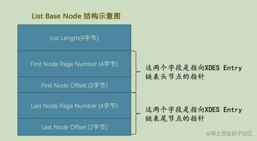 上面我们已经介绍了很多种链表。那么我们是如何找到这些链表的呢?InnoDB设计了一个List Base Node 的结构。这个结构包含了链表的头节点和尾结点的指针以及链表中包含了多少结点的信息。