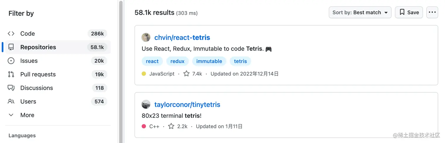 写这篇文章的时候,我发现一款经典的游戏会有很多同类型的开源项目,比如在 GitHub 上搜「俄罗斯方块」会找到 5 万个开源项目,但是能够做到和文中的「Hextris」和「react-tetris」,同等品质的开源项目却寥寥无几。