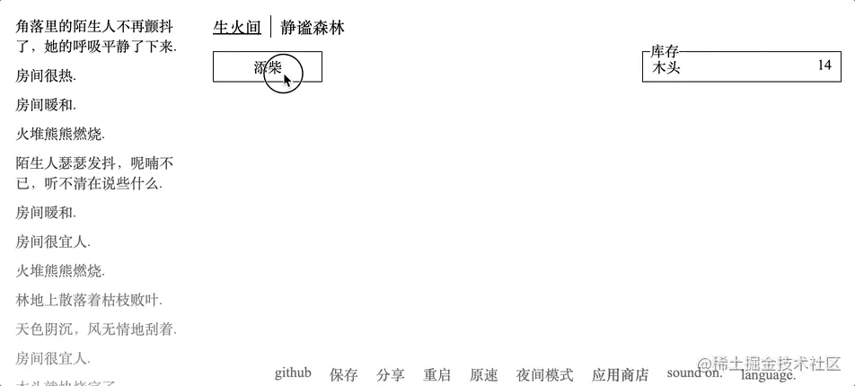 该游戏前期有些无聊只能点击 添柴,没玩过的同学刚开始容易摸不着头脑,因为事件触发需要时间,看滚动的文字+点击 添柴 耐心等 30 秒,就会触发新的事件,从而开启你的冒险之旅。游戏默认会保存游戏进度到本地,另外还支持导入/导出存档。