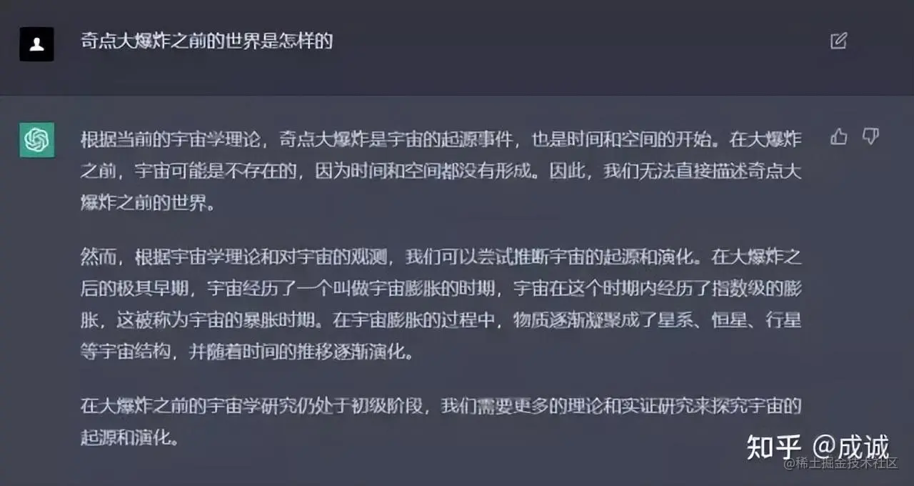 这个问题没有答案, ChatGPT 的解释也是合理的。正巧它提到了大爆炸,因此我又问了: