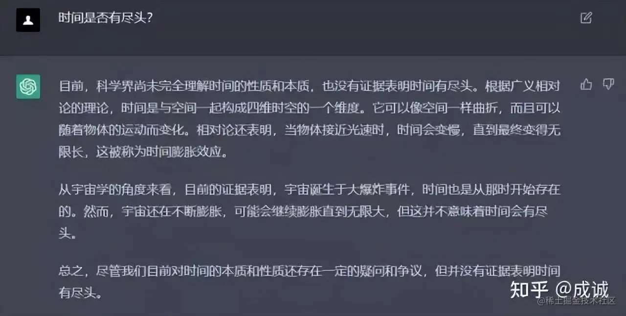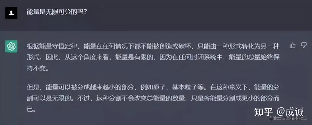 因为深度学习的模型训练效果很依赖数据的质量,而互联网数据中,有关科学的问题是相对较少的,所以我想问问 ChatGPT 对于一些科学问题的观点是怎样的。目前来看,除了第一个能量无限可分的问题答错了,其余的都比较中肯: