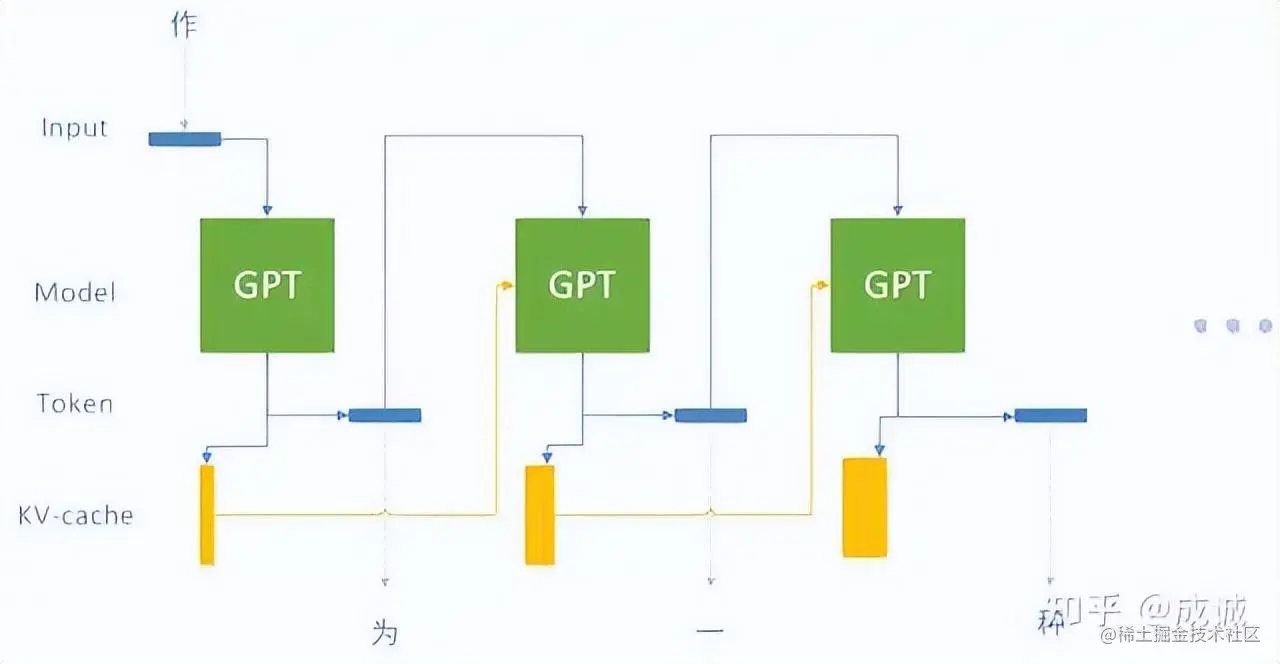 这里的 token 可以理解为输出的词,就是 ChatGPT 回复你的话,而 kv-cache 则包含了此次会话的上下文内容,随着聊天的进行,这个 cache 张量会不断增加,cache 每次都会参与下一个 token 的生成过程。下图粗略地反映了这样一个生成过程。而在整个生成过程中,模型是不变的。一个新的会话的 cache 也会和之前会话的 cache 无关。