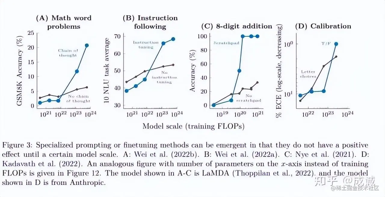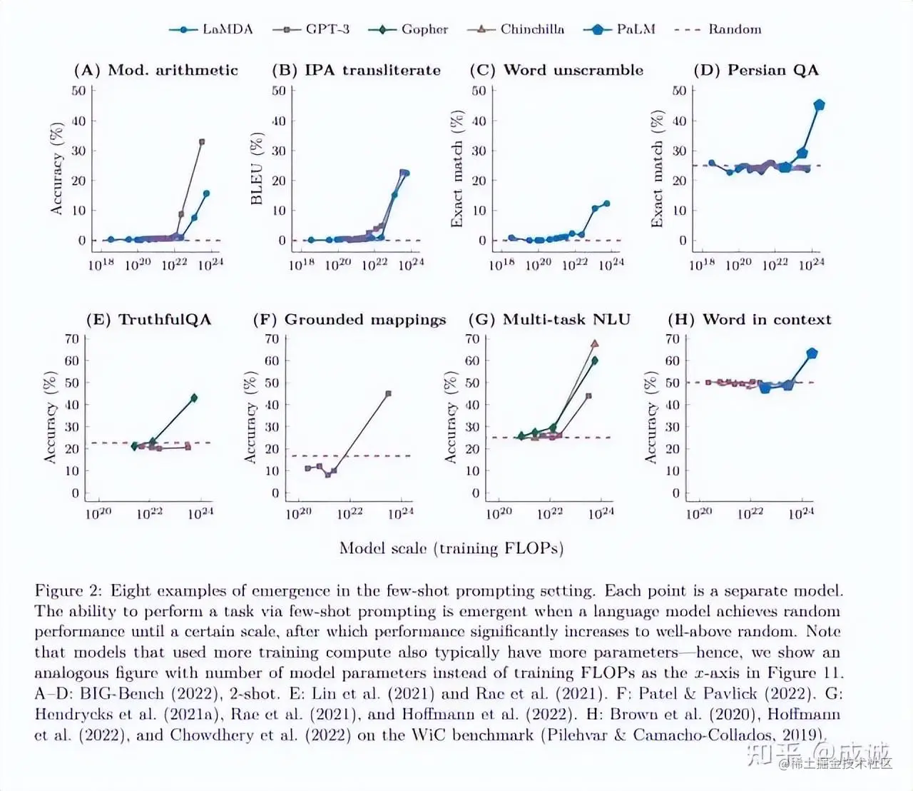 但对于大模型的“能力涌现”(Emergent Abilities)是没有人预测到,且目前也无法完全解释清楚的现象。即:当模型的参数规模超过数百亿参数以后,大模型的语言理解能力、逻辑推理能力、问题分析能力陡然上升。 这种现象就好像当模型增大到一定程度以后,它就突然拥有了完全理解自然语言并完全理解人类知识的能力。