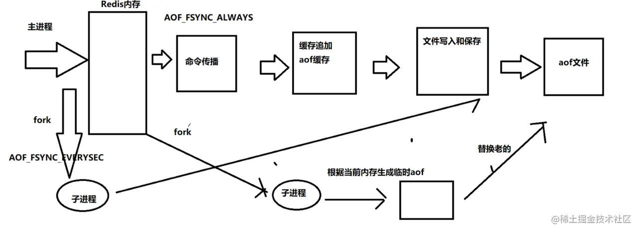 WRITE:根据条件,将 aof_buf 中的缓存写入到 AOF 文件。 SAVE:根据条件,调用 fsync 或 fdatasync 函数,将 AOF 文件保存到磁盘中。