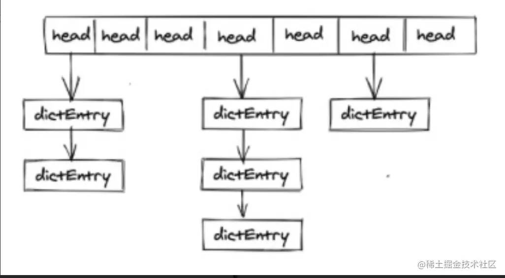 redis内部整体的存储结构是一个大的hashmap,内部是数组实现的hash,key冲突通过挂链表去实现,每个dictEntry为一个key/value对象,value为定义的redisObject。