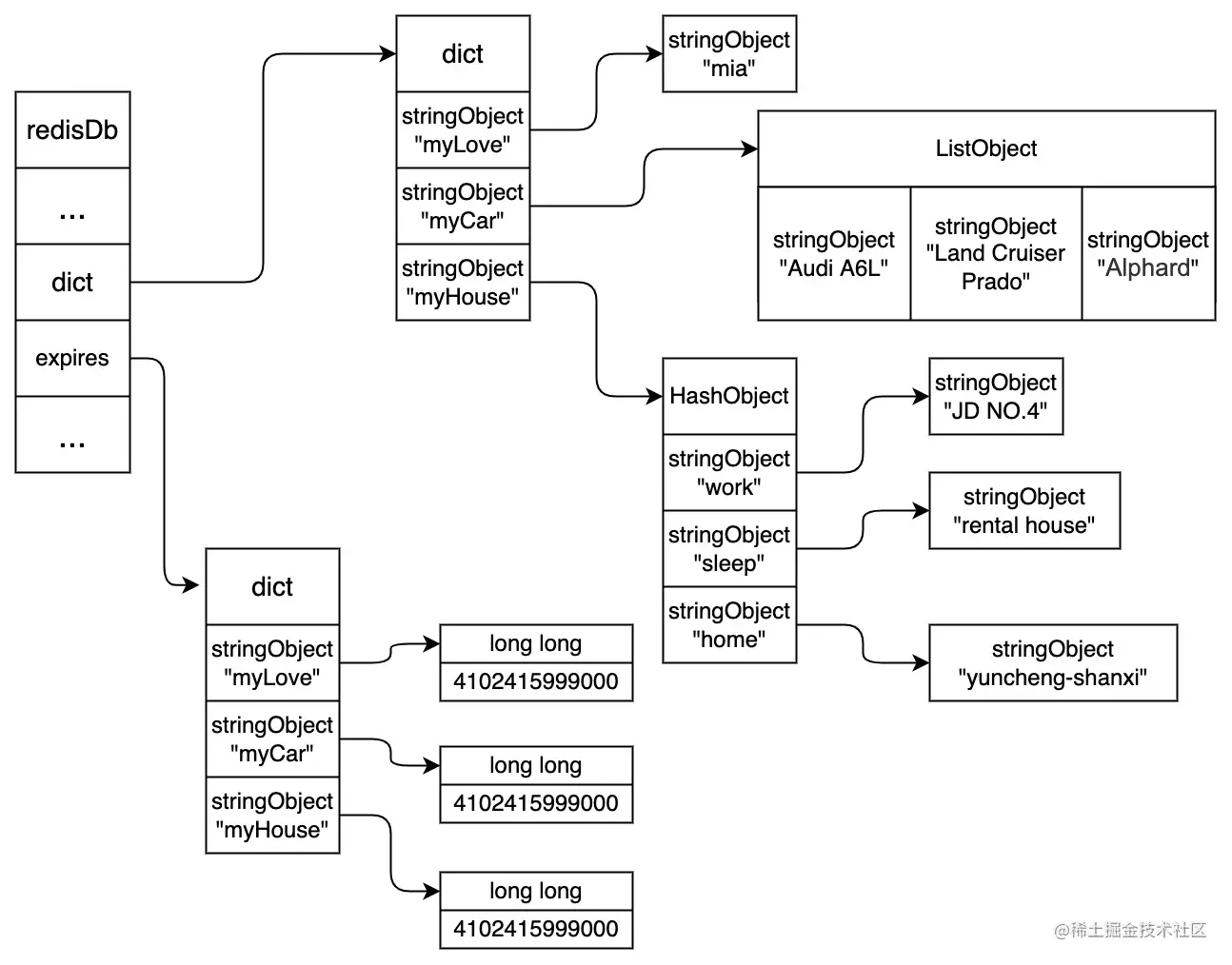 •Key:图中右上角可见,Key("myLove")并不是直接以字符串存储,而是存储在SDS结构中。