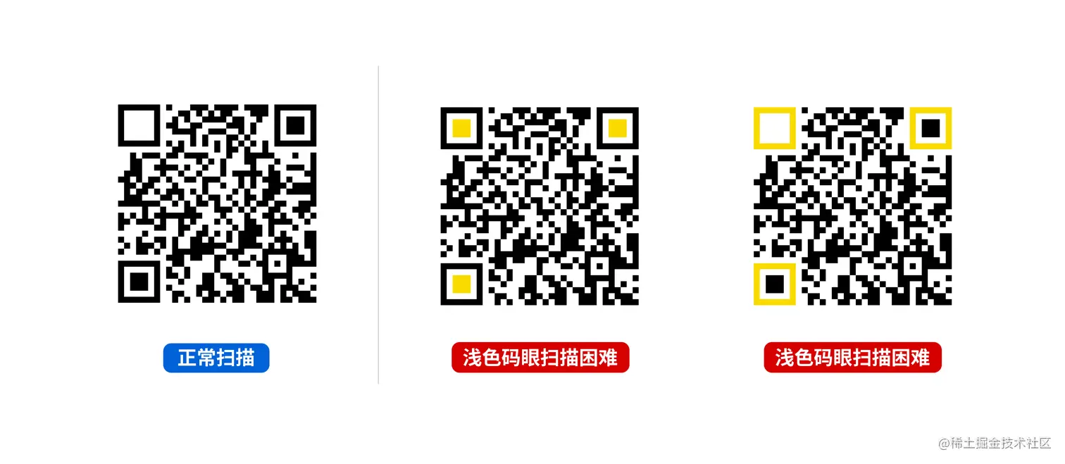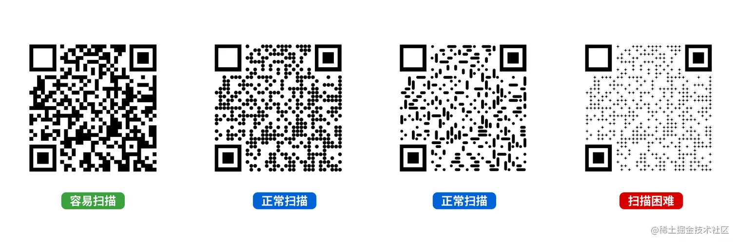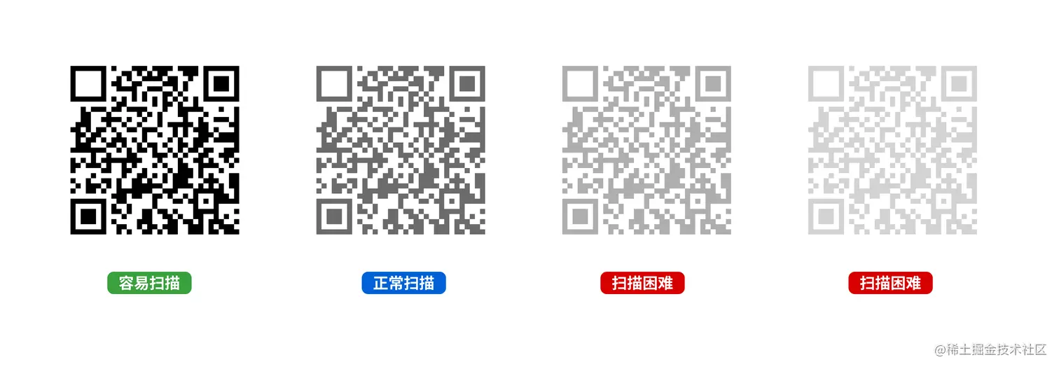 二维码类型众多,我们以最常见的 QR 二维码为例说明,以下因素都会影响到二维码的识别率: