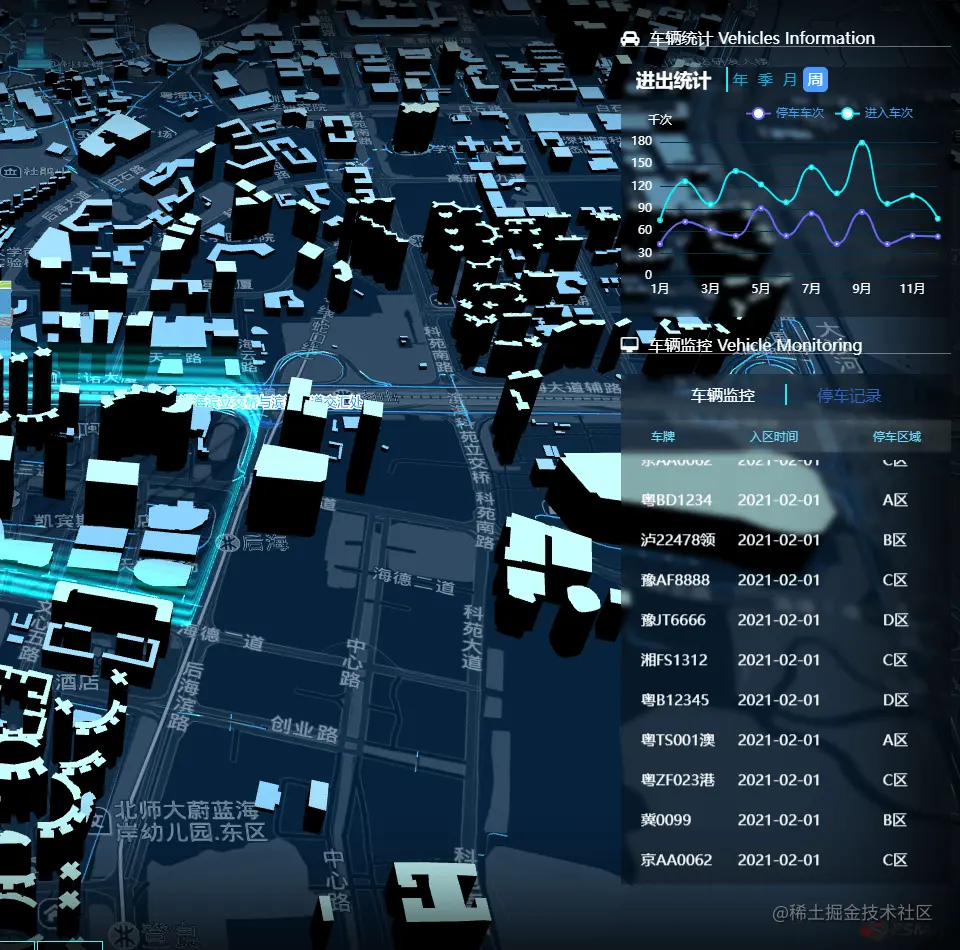 以3D可视化技术为基础,通过三维场景完整的呈现的智慧停车场整体建设情况。结合物联网和视频监控,停车场整个车辆管理情况实时动态呈现。提供道路状况、车辆统计、车辆监控、停车记录、无感支付等多个应用场景需求功能。