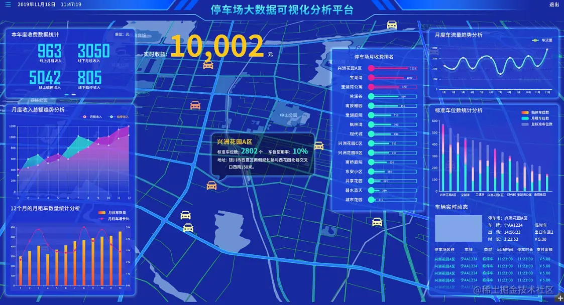 同时提供智慧停车实时监控功能,通过数据展示的形式了解今日运营情况,显示内容包括:直观监查车位使用情况、停车营收情况、车辆信息;让停车管理者对车位的管理和统筹提供了有效的管理依据。