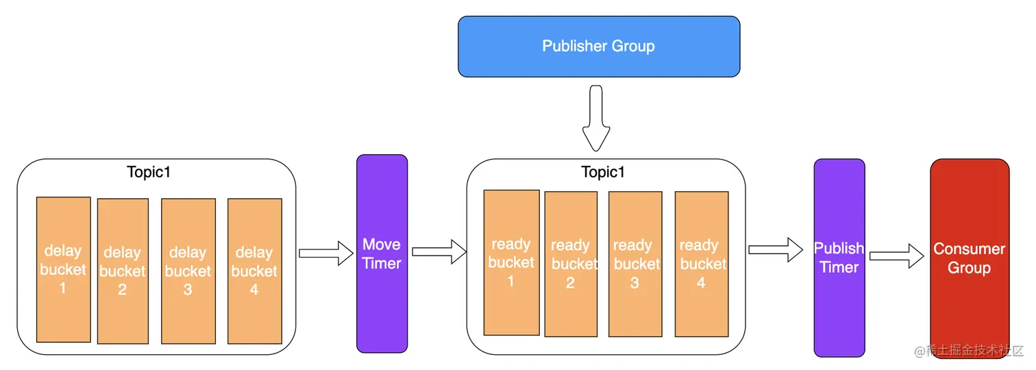 通过搬运线程,将达到执行时间的任务移动到发布队列中,等待消费者获取。