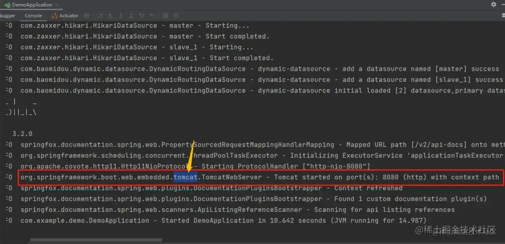 默认 Tomcat 容器启动,请看如下启动日志,当控制台输出[ Tomcat started on port(s): 8080 (http) with context path '' ]则证明 tomcat 容器启动正常。