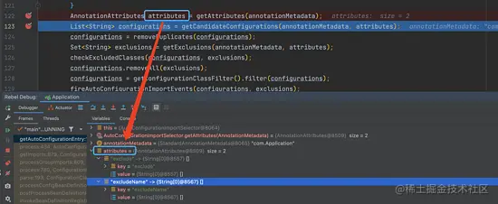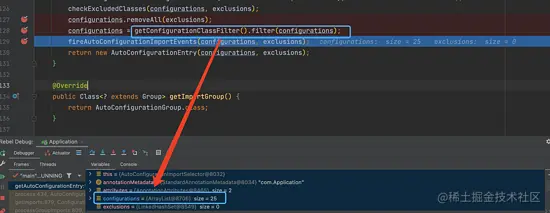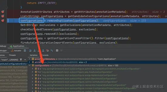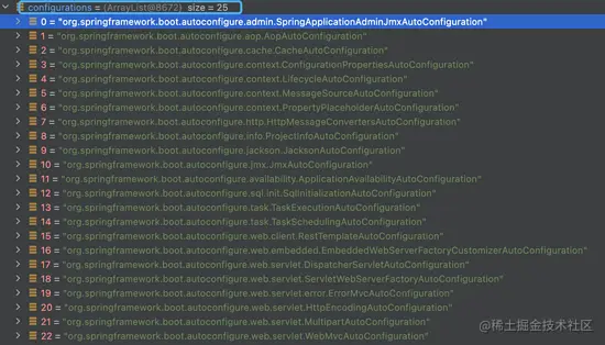 getAttributes获取@EnableAutoConfiguration中的exclude、excludeName等。getCandidateConfigurations获取所有自动装配的配置类,也就是读取spring.factories文件,后面会再次说明。removeDuplicates去除重复的配置项。getExclusions根据@EnableAutoConfiguration中的exclude、excludeName移除不需要的配置类。fireAutoConfigurationImportEvents广播事件。- 最后根据多次过滤、判重返回配置类合集。