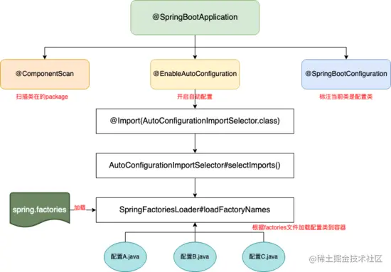 @SpringBootConfiguration通过与@Bean结合完成 Bean 的 JavaConfig 配置;@ComponentScan通过范围扫描的方式,扫描特定注解注释的类,将其注册到 Spring 容器;@EnableAutoConfiguration通过spring.factories的配置,并结合@Condition条件,完成 bean 的注册;@Import通过导入的方式,将指定的 class 注册解析到 Spring 容器;