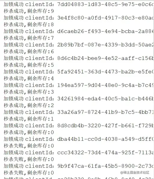 public int lockStock() { String lockKey="lock:stock"; String clientId = UUID.randomUUID().toString(); //加锁 RLock lock=redissonLockUtil.lock(lockKey); lock.lock(); try { logger.info("加锁成功 clientId:{}",clientId); int stockNum= Integer.valueOf((String)redisUtil.get("seckill:goods:stock")); if(stockNum>0) { stockNum--; redisUtil.set("seckill:goods:stock",String.valueOf(stockNum)); logger.info("秒杀成功,剩余库存:{}",stockNum); } else { logger.error("秒杀失败,剩余库存:{}", stockNum); } //获取库存数量 return stockNum; } catch (Exception e) { logger.error("decry stock eror",e); } finally { if(lock!=null) { lock.unlock(); } } return 0; }