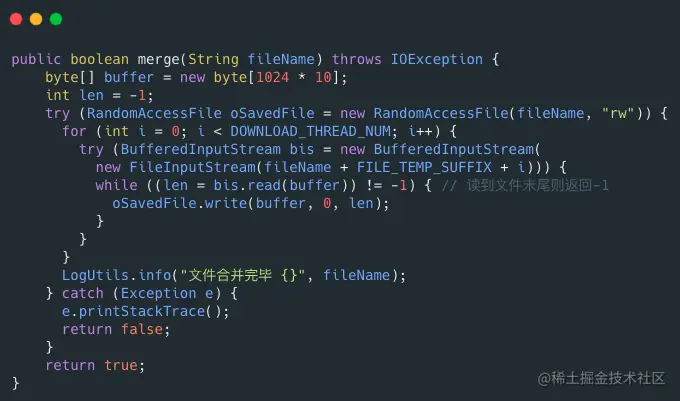 RandomAccessFile 可以帮助我们合并文件分片,示例代码如下:
