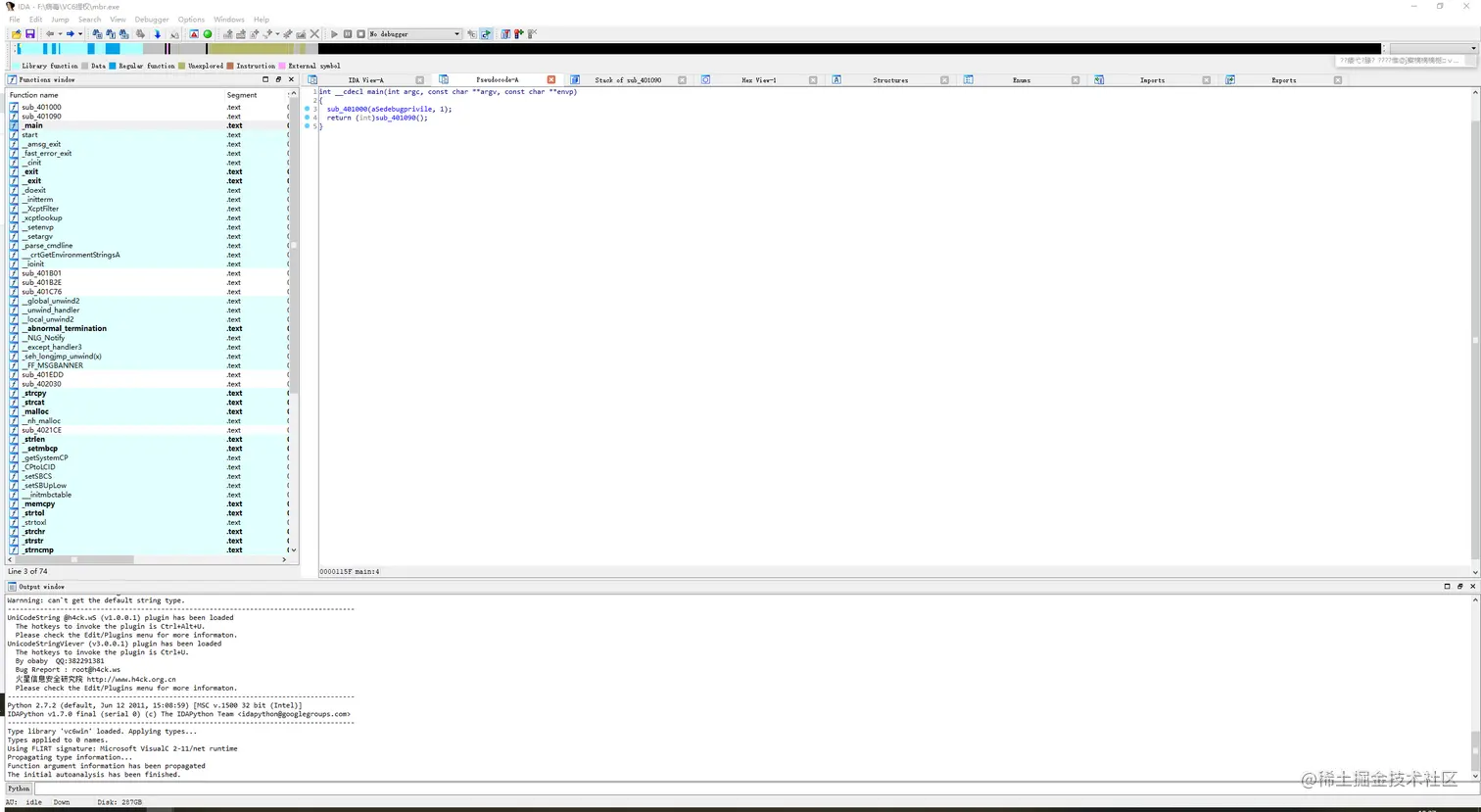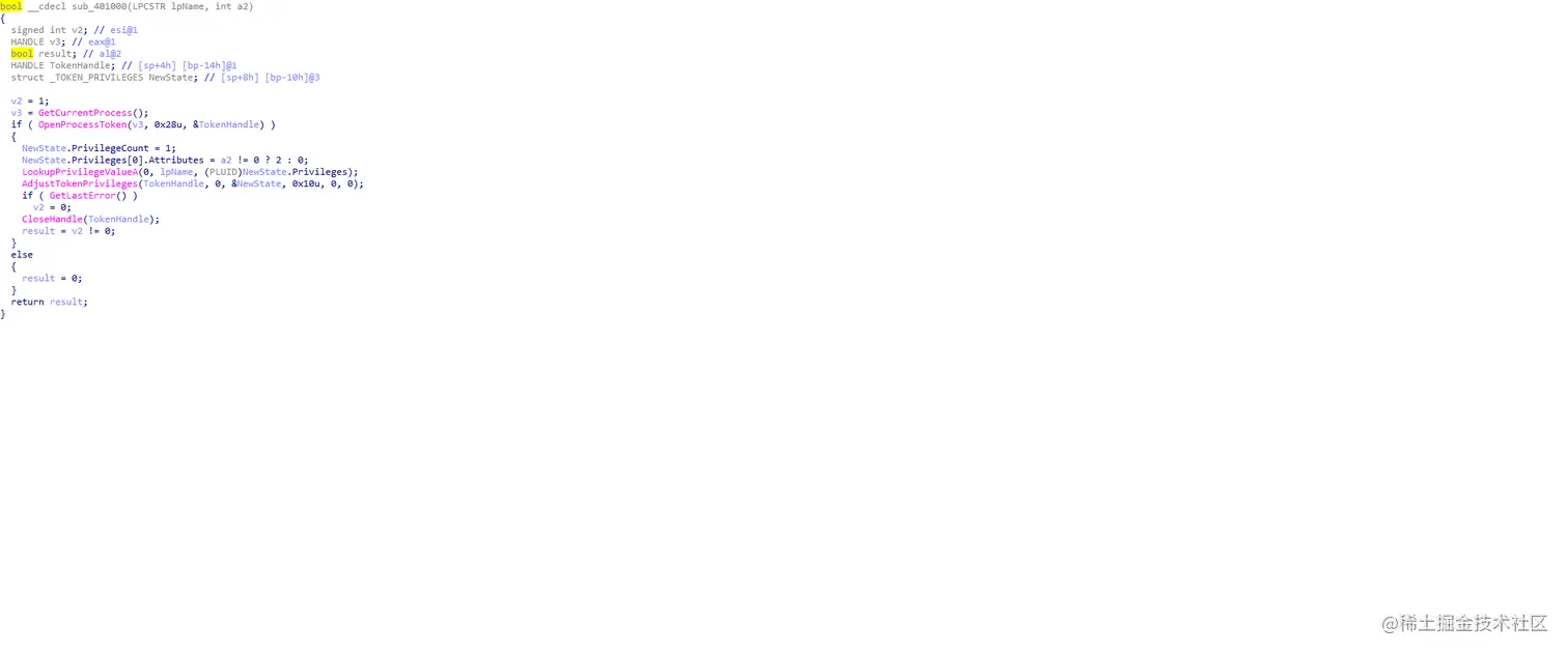 可以看到只有俩个函数,先看第一个,参数SeDebugPrivilege是Windows字符权限名称,大概已经知道第一个函数是干嘛的了,进入sub_401000中: