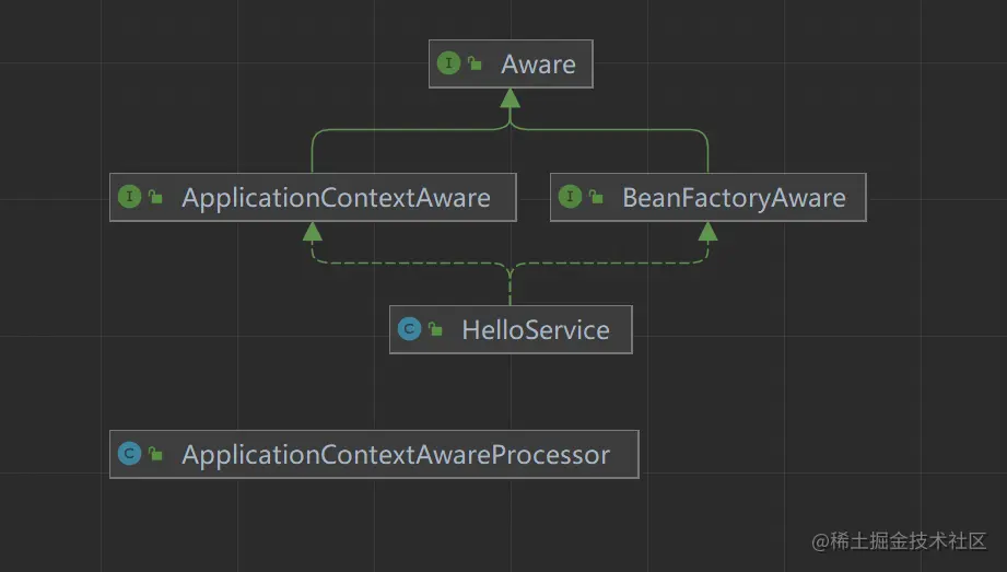 Aware是感知、意识的意识,Aware是标记性接口,其实现子类能感知容器相关的对象。常用的Aware接口有BeanFactoryAware和ApplicationContextAware,分别可以让实现者感知所属的BeanFactory和ApplicatonContext。
