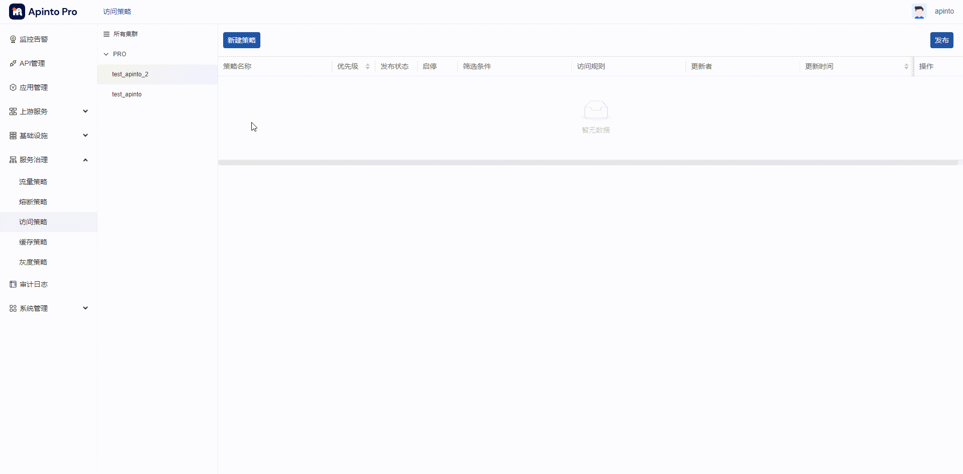 在Apinto中,您可以通过访问策略对应用、API、上游服务、IP等多个维度进行黑白名单访问控制。此外,我们还支持使用多个访问策略进行逐层匹配,以进一步满足您的安全需求。