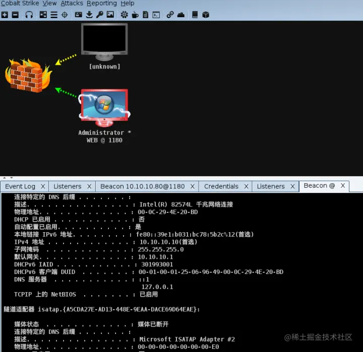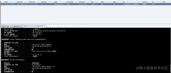 直接丢一个免杀马,上线cs,这里就可以看到这台机器是存在两张网卡