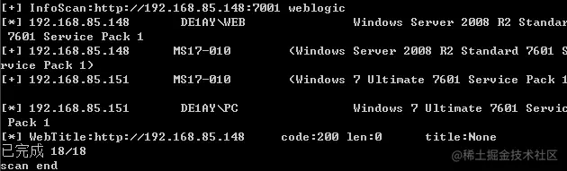 已经知道目标机器是存在两张网卡的,192.168.85.1/24和10.10.10.1/24 上传fscan扫描一下这两个段 扫描192.168.85.1/24发现还存在一台192.168.85.151的机器,并且存在ms170-10漏洞