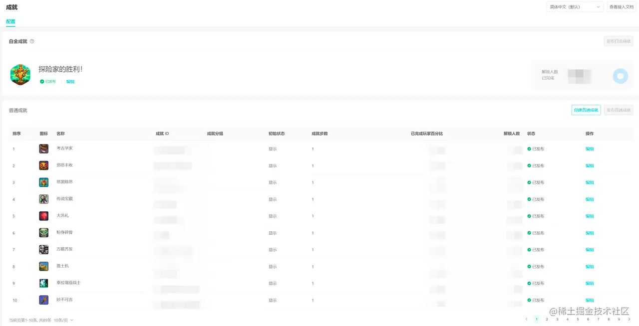 成就后台的配置也非常简单,并且可以看到每一个成就的解锁人数、完成率等数据。