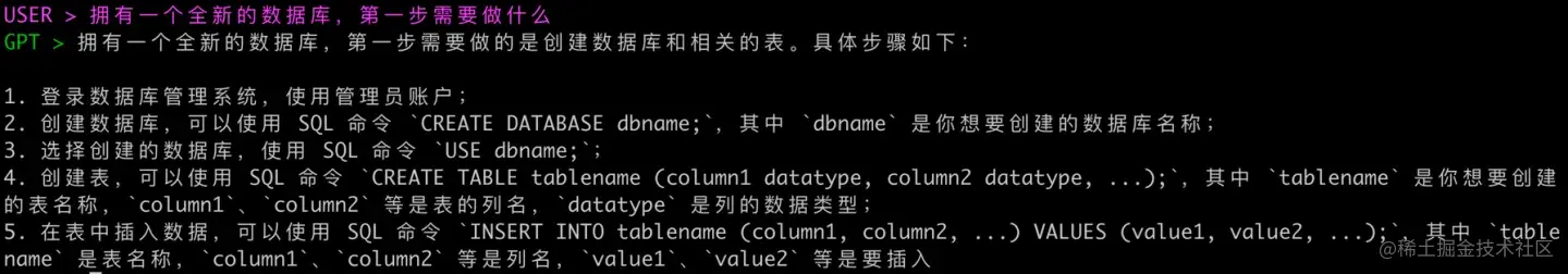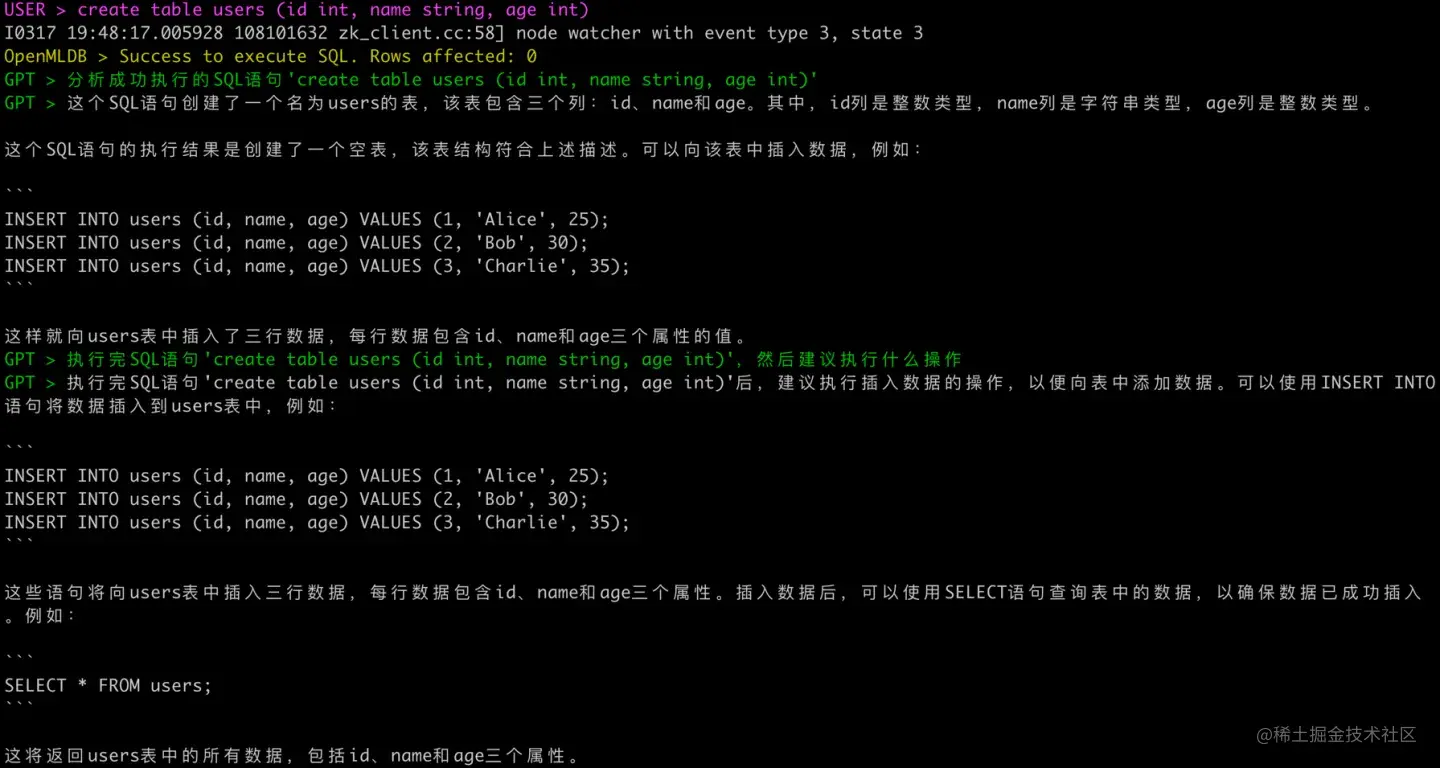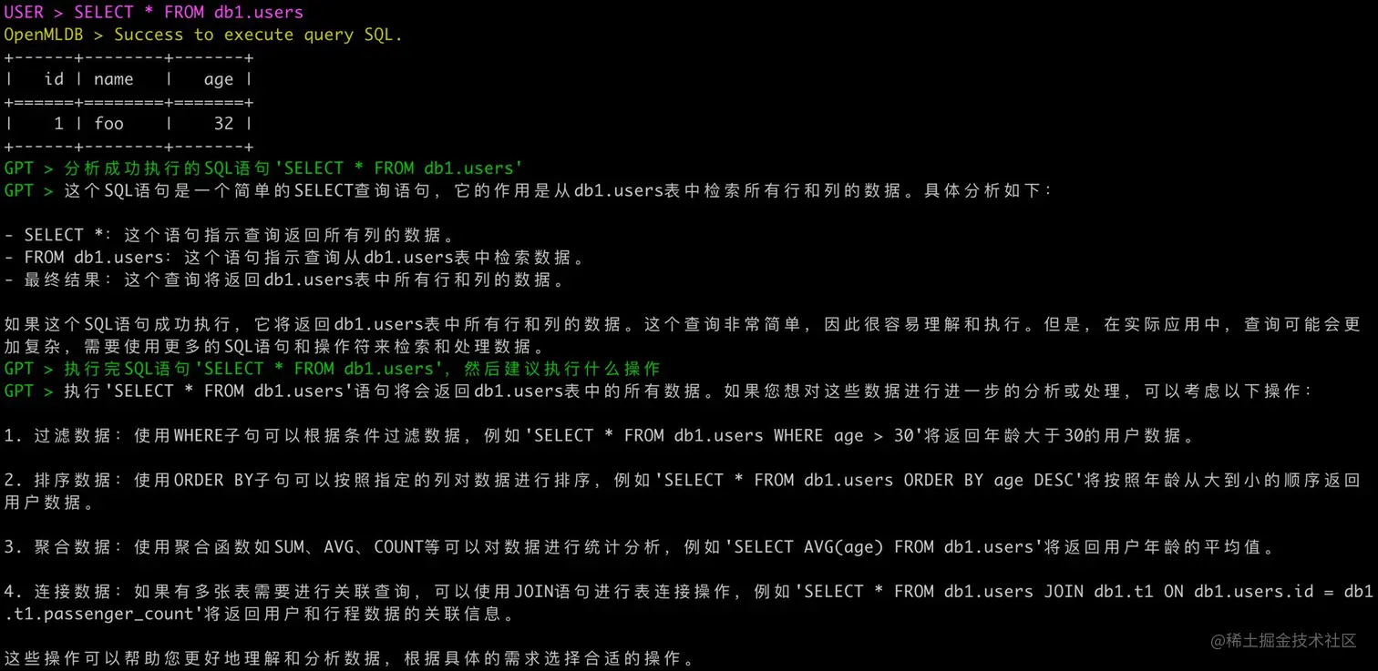 用户在 GPT 插件执行的 SQL 代码,实际也会提交到 OpenMLDB 集群执行,并且用户输入( User > )、数据库输出( OpenMLDB > )和 GPT 模型输出( GTP > )都会有不同的前缀和颜色区分。