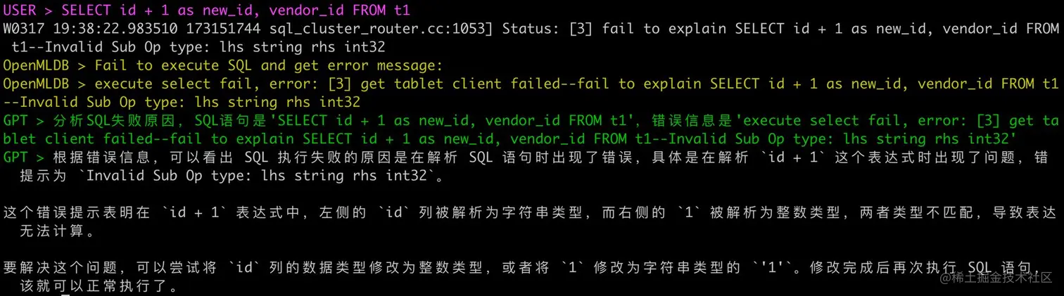 前面例子展示的是能够成功执行的 SQL ,对于用户已经编写没有语法错误的 SQL 进行分析只是“锦上添花”,但如果可以快速帮助用户解决执行失败的 SQL 那才是“雪中送炭”。通过 SQL 语句本身以及 OpenMLDB 提供的错误信息,ChatGPT 模型显然是具备这种 SQL 调试以及 SQL 更正的能力。