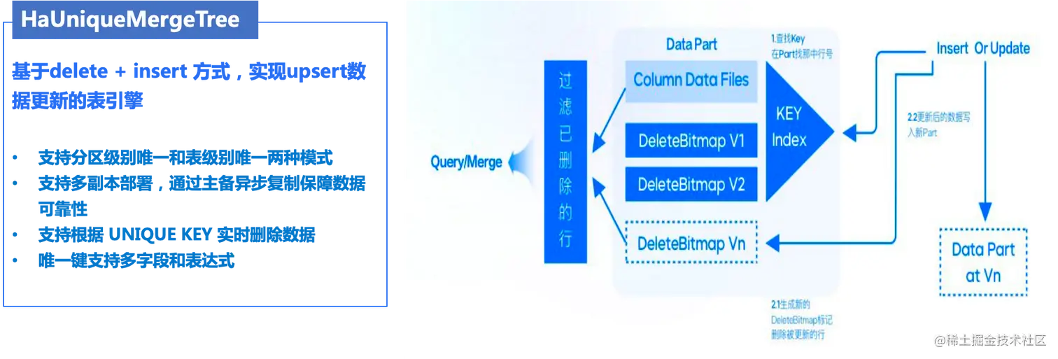 基于以上业务场景的需求,我们自研了基于主键更新数据的表引擎 HaUniqueMergeTree,该表引擎即满足高效查询性能要求,又支持基于主键更新数据的表引擎,有如下特性: