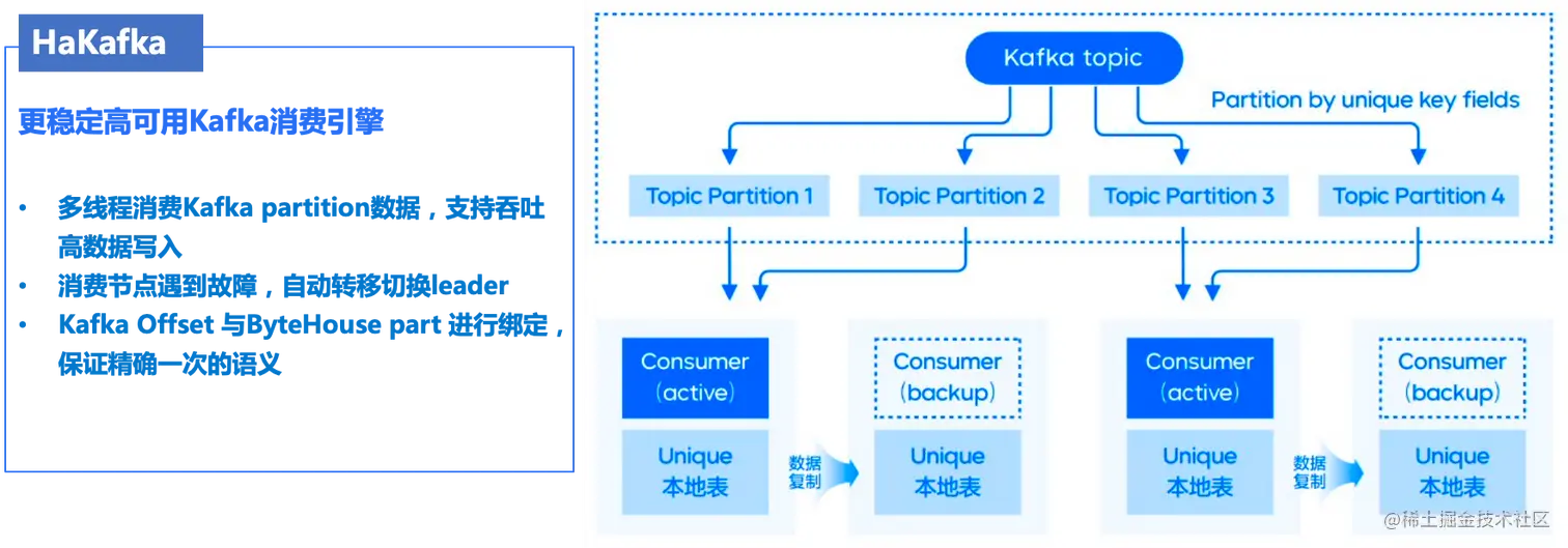 面对业务大数据量的产生,需要高效可靠实时数据的接入能力,为此我们自研了 Kafka 数据源接入表引擎 HaKafka ,该表引擎可高效的将 Kafka 的数据接入 ByteHouse ,具有有如下特性: