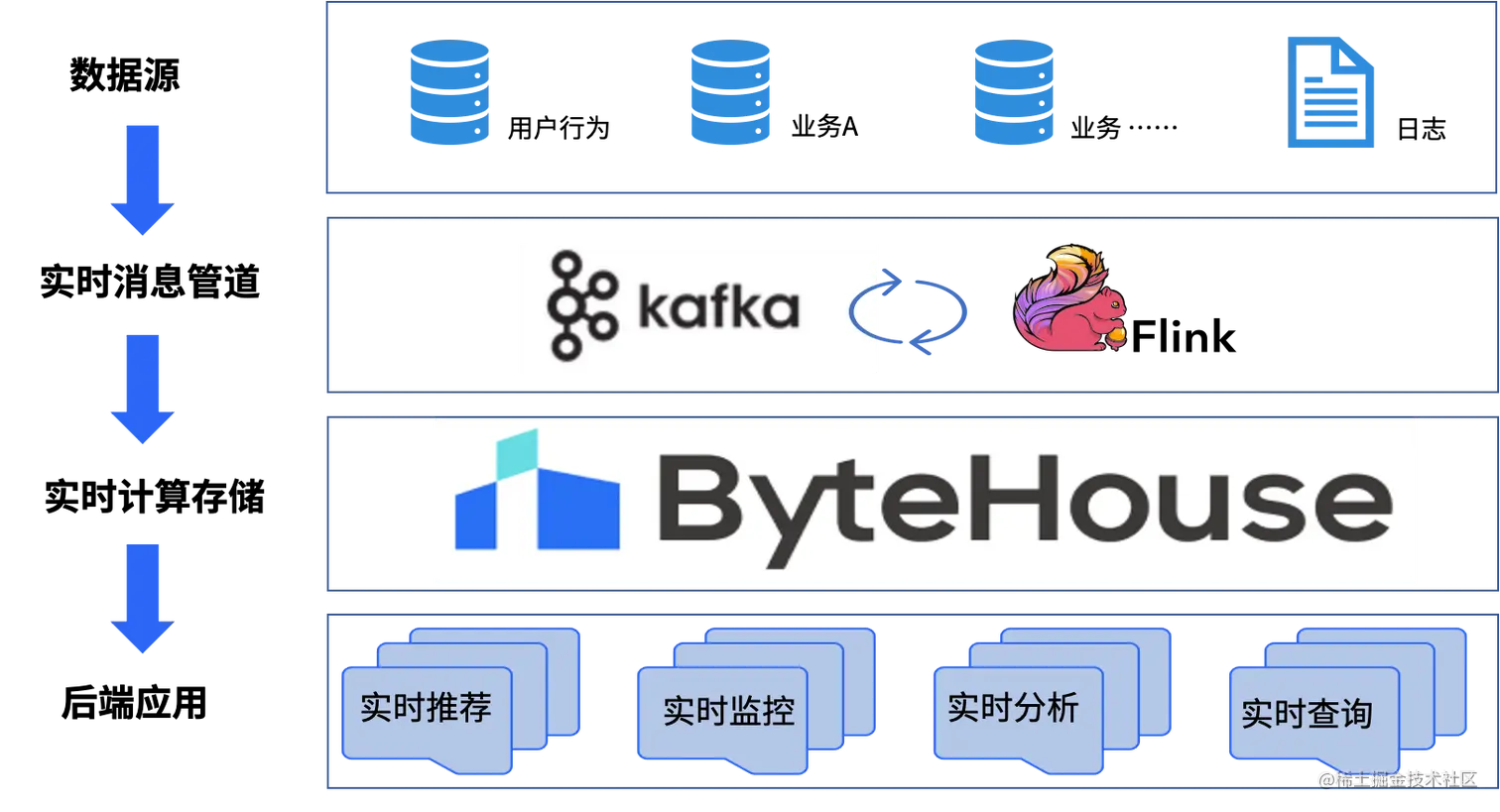 借助 Flink 出色流批一体的能力,ByteHouse 极致的查询性能,为用户构建实时数仓,满足业务实时分析需求。