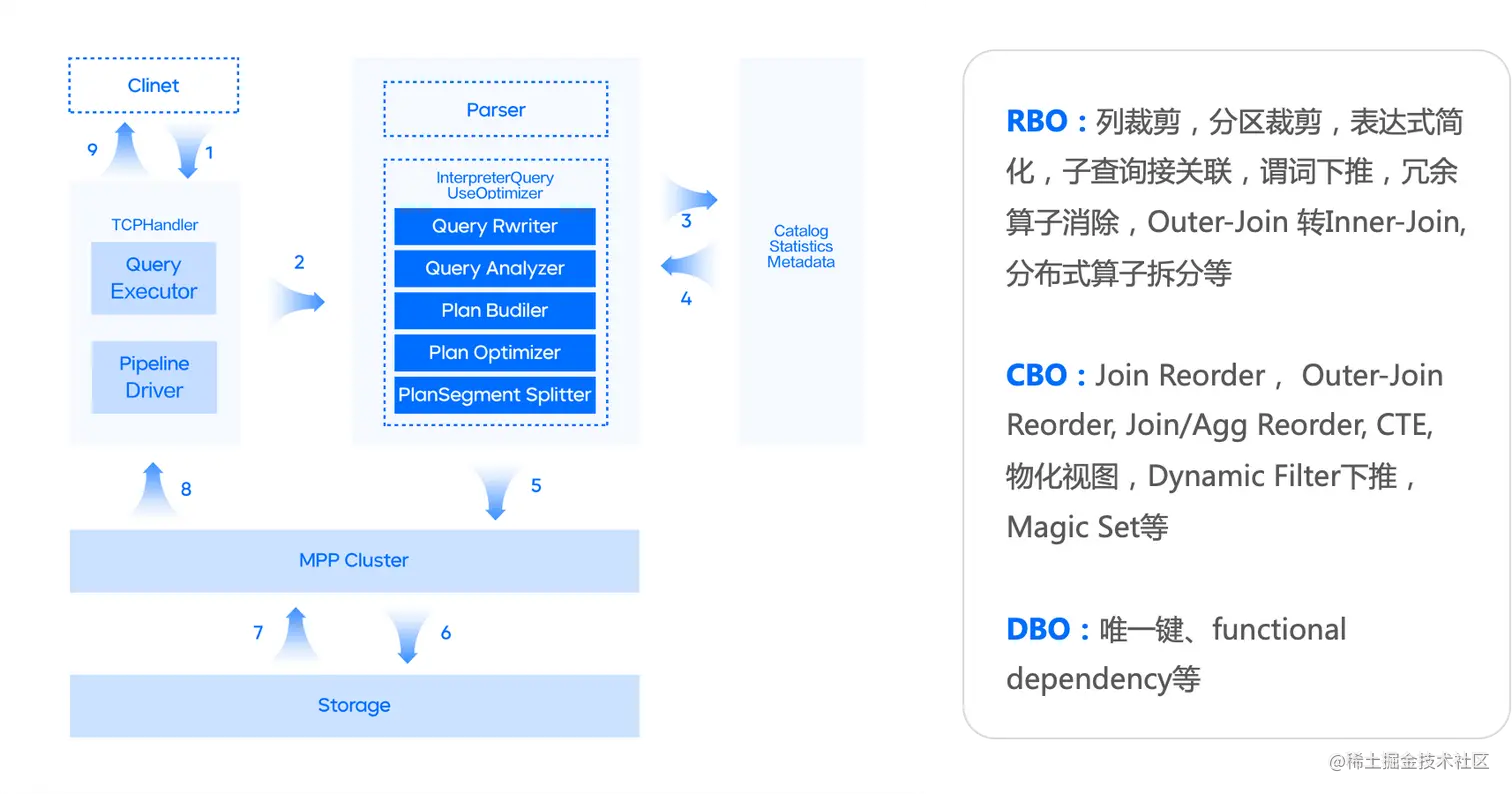 - 高阶优化能力,实现了 Dynamic Filter pushdown、单表物化视图改写、基于代价的 CTE (公共表达式共享)。