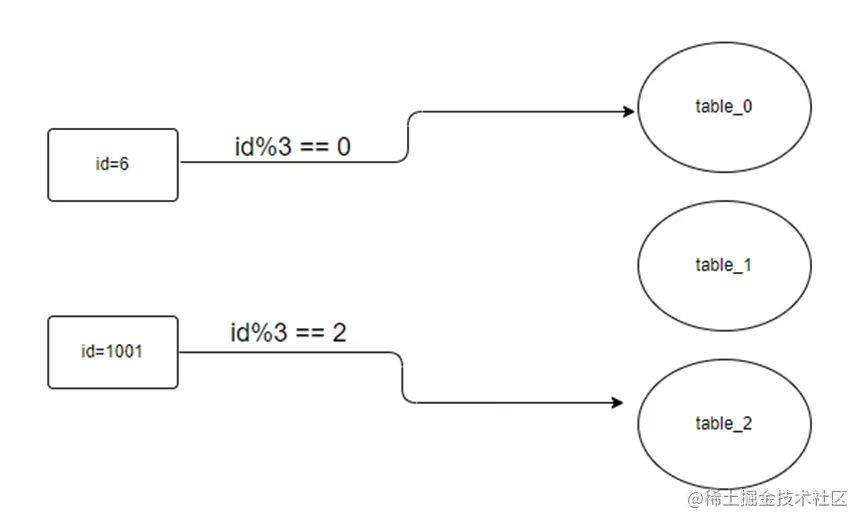 这个方案比较好理解,例如,我们假设未来几年内,数据能够增长到3000万,那,我们可以设计3张表,设表名分别为:table_0, table_1, table_2, 每张表存1000万数据,我们利用id作为路由key,进行算法处理,将hash运算后的结果与3进行取模,然后根据所得的值,可以将数据存放到对应的表中。这种方式的优点是,数据可以均匀分散的存储到对应的表中,不会造成数据全部存储到一个表中的情况,造成热点库表;但是缺点的话也很明显,就是如果以后再需要扩容的话,再新增表后,例如又新增了 table_3, table_4, table_5, 新的取模就从3变成了6,那这时候,之前的表中的数据,就需要做全量的数据迁移,因为取模的值发生了变化,按照新值取模,可能就找不到数据了。那面对大量的已有数据,数据迁移就比较麻烦了。