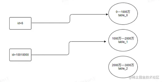这个方案,也比较好理解,还假设业务后期数据能增长到3000万,也是可以设计3张表,设为:table_0, table_1, table_2,我看可以按照范围,将id在0—1000万的数据,存放在table_0中,id在1000万—2000万,存放在table_1中,id在2000万—3000万,存放在table_2中。这种方案的话,优点很明显,就是即使以后扩容,也很方便,直接增加新的表即可;但是缺点的话,也很明显,数据不能做分散存储,在某一段儿时间内,数据都会集中存储在特定的表中,造成单个表压力过大。