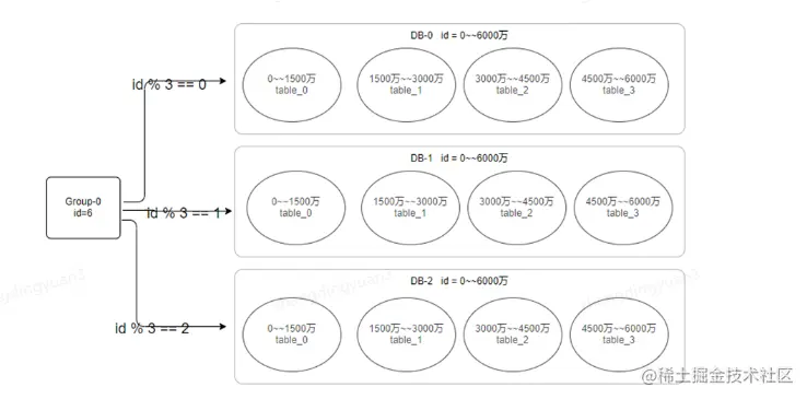 我们假设有一个分组的概念,假设项目初期,预期几年内的数据,数据可以达到6000万,可以做如下设计: