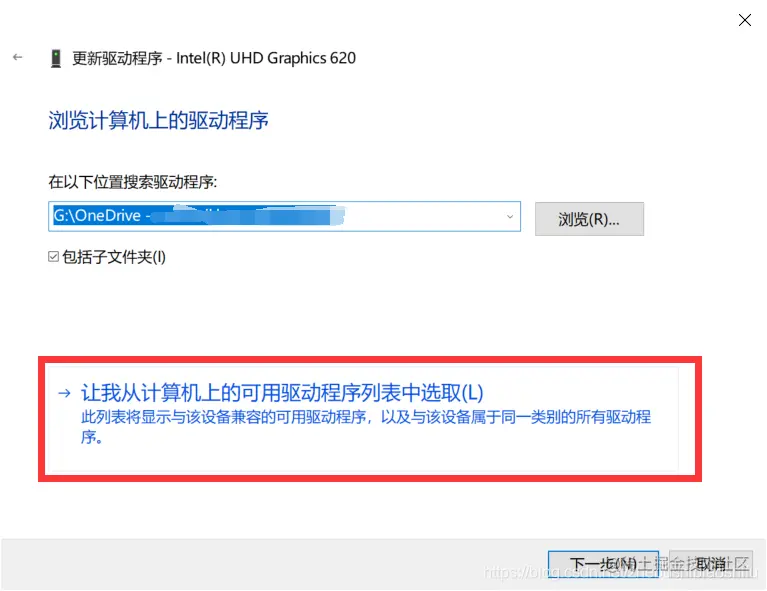 再选择“让我从计算机上的可用驱动程序列表中选取”。