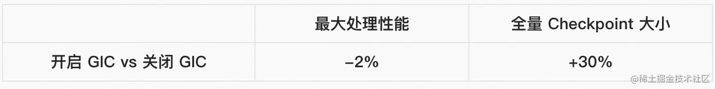 表格-1: 在 WordCount 中开启 GIC 后的收益Unaligned Checkpoint (UC) 可以大大提高反压下 Checkpoint 的完成率。 之前版本的 UC 会写入过多的小文件,进一步可能会导致 HDFS 的 namenode 负载过高。社区在 1.17 版本中解决了该问题,使 UC 在生产环境中更加可用。
